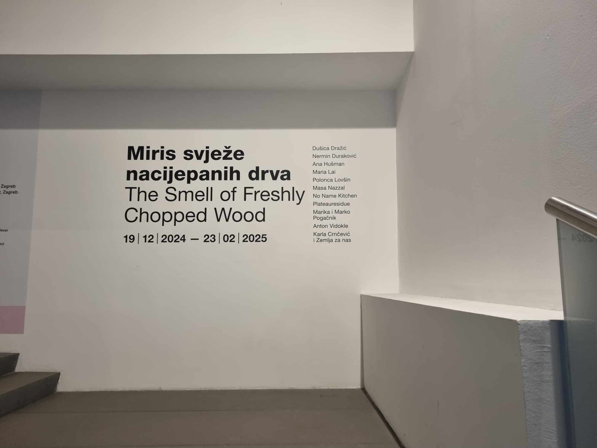 Izložba Miris svježe nacijepanih drva govori o ljudskoj prisutnosti u vrlo konkretnim krajolicima, šumama, otocima, visoravnima i dolinama Balkana i mediteranske regije – Hrvatske, Slovenije, Srbije, Bosne i Hercegovine, i Italije. Iako na prvi pogled izgledaju kao idilična priroda, to su zapravo „živi arhivi“ čiji su „dokumenti“ stabla obilježena za sječu, umjetna jezera, predmeti ostali od izbjeglica ili pak sjećanja ljudi koji tu žive, njihova tradicija, znanja i iskustva.